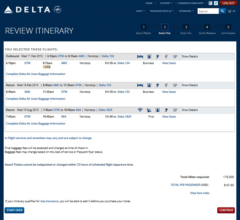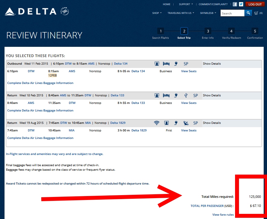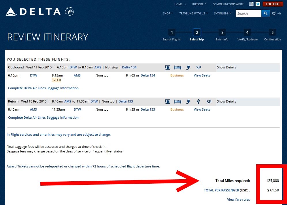 Yep the total price stayed at the 125,000 miles basically giving you a free one-way and with two of these types of tickets back to back you got 3 trips for the price of 2. This was one of the great values of Skymiles over many other frequent flyer programs. It seems no more as Skymiles2015 begins to take hold. Take a look at these SAME dates pulled up today on Delta.com that I used above in my demonstration: