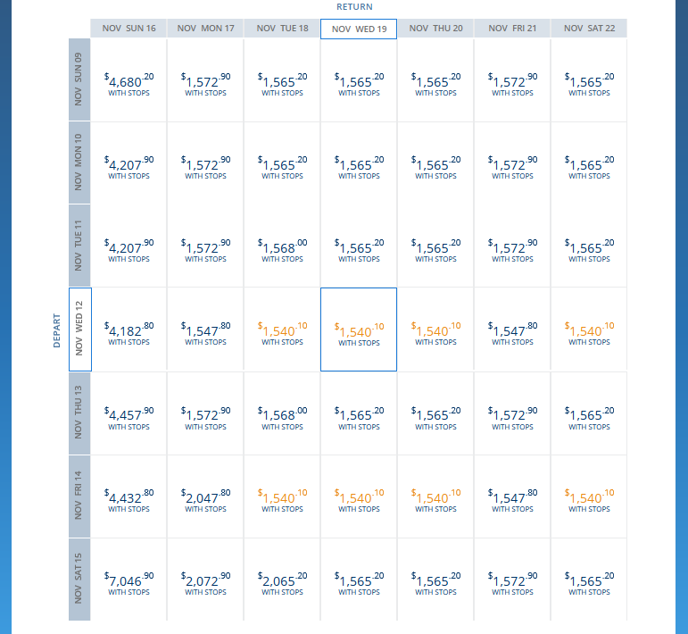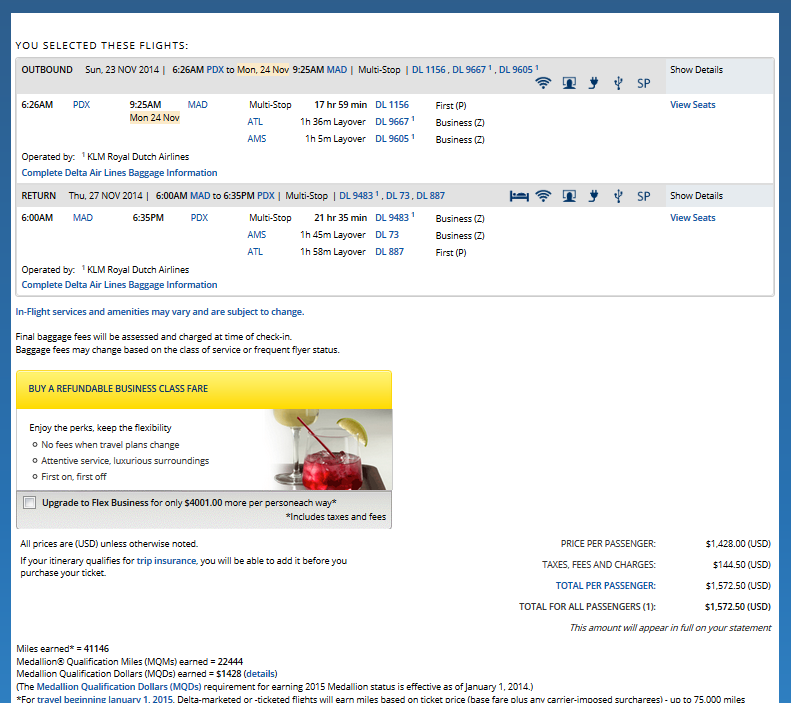 ITA Matrix seems to be having issues but this is wide open doing mulit-day search on Delta.com. Lots of open dates with at least a few days stay. Again, this is business class and you can mix and match DL and KLM or whatever you want to fly (like a 747 with new business class from KLM). What a great vacation and way to top off your MQMs for the year! Here are the numbers with a HT to FT on this one!