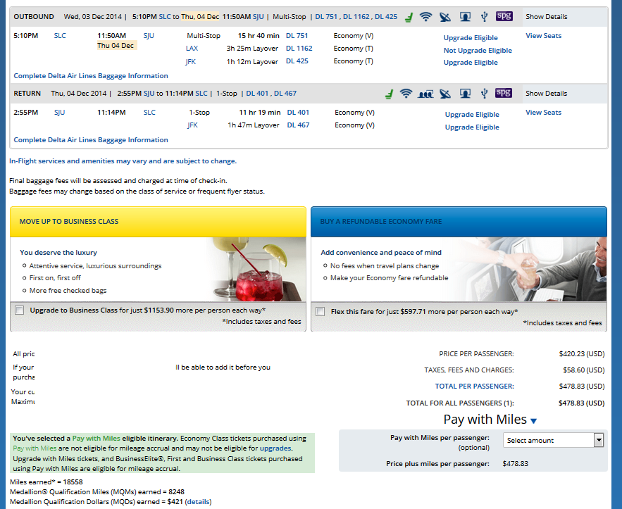 No home run on this one but for a HUB run the CPM is shall we say tolerable. I would much rather position and pick up points, more chances for bumpertunites, but I get TONS of emails asking about SLC runs so I will post a few today that I can find before year end. Now I do like the large MQMs you get and you are getting them TONS cheaper than Delta will likely sell them to you soon. Here is what I found: