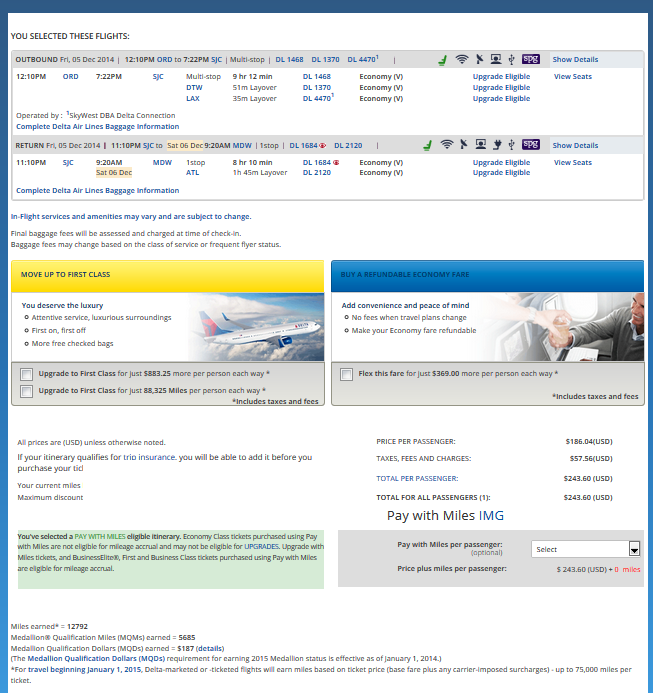 Chicago to San Jose $244 & 5685 at 4.3CPM weekday / weekend Delta Mileage Run