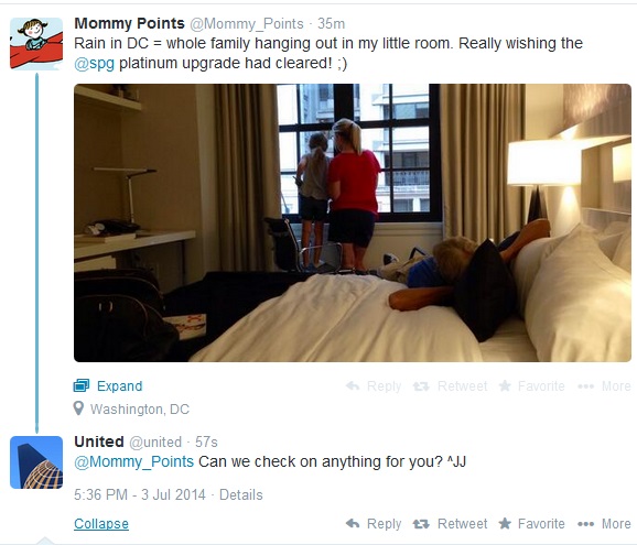 This last one made me howl out loud. I mean I get companies have to dance such a thin line when it comes to social media. Try to be funny and if not work and you get crushed. Do nothing and you get called out for being a hard-hearted corporate beast. So here, my fellow blogger Summer tweets and United decided to jump in and see what they can do to help. Errr, uh, United, I don’t think you own any SPG hotels. And if you did, I am sure they would be broken (I think I should ask Fake Jeff about this one)!