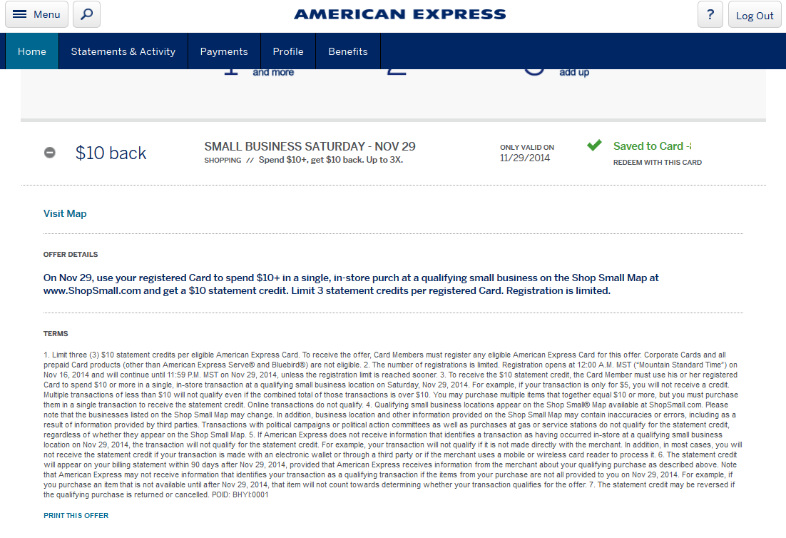 That is a nice list of AMEX cards both personal and business. Now when we looked, by logging in to AMEX, only one of the cards on this list showed that it was targeted for the promo and it was simple to click on it and be done. What about the rest?