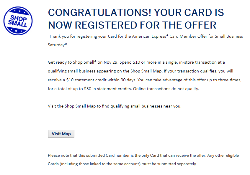 Then when I went back to my AMEX account online I could now see I was indeed registered for the SBS event for each card plus I got an e-mail confirming I was all set and good to go. Most AMEX cards will work but not all. Gift cards will not nor some from other banks that simply have the AMEX logo on them.