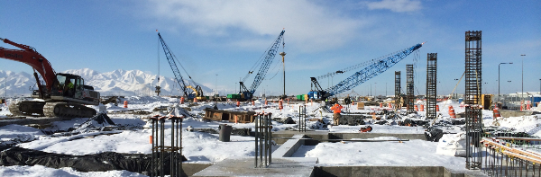 “This photo captures the complex construction of new rental car facilities near the existing parking garage. The large cranes are used to insert stone columns deep into the ground to support new buildings. $80.7 million of construction is now underway for the new $138 million rental car facilities and completion of the south parking lot.”