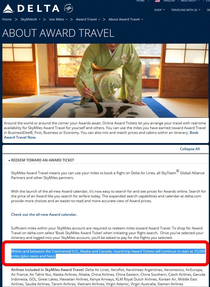 Within and between the Continental U.S., Alaska and Canada, round-trip Award Tickets will continue to start at 25,000 miles (plus taxes and fees).”