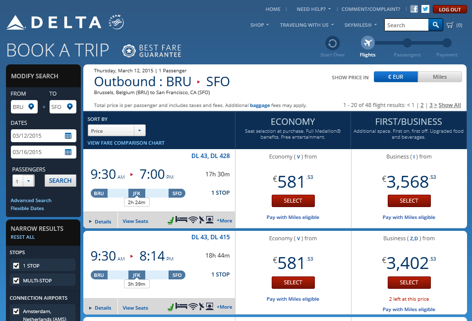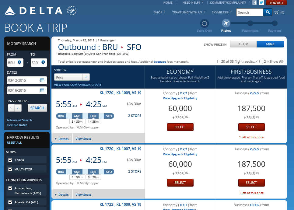 No, you are not seeing things and I did not photo shop this. You will pay 72.98 Euros MORE to buy the ticket and Delta will empty 92,500 points from your account on top of that. Is this a one time thing? Let’s look at two more.