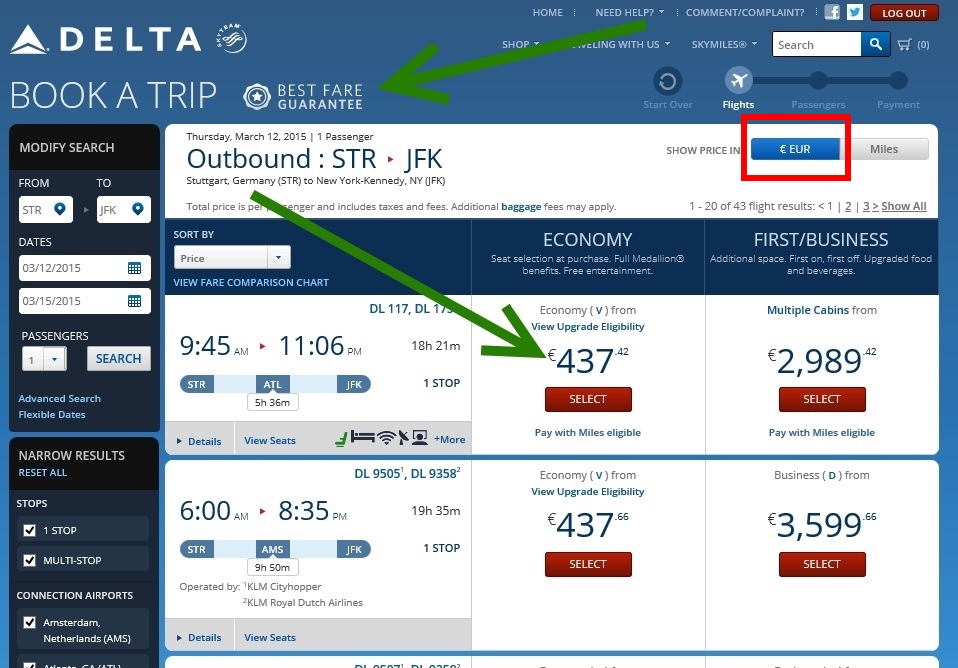 So in this one example, if you pay for the ticket from Germany to New York it would cost you 437.42 Euros for the weekend round trip. But notice if we want to spend our SkyRubles for this same trip. It will cost us just 510.40 Euros plus 92,500 points.