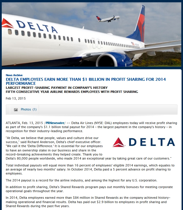 Last month Delta took out full page ads in major newspapers. They YELLED from on high everywhere they could how they have, in the past year, been able to pay out what amounts to about 2 months wages in profit sharing for Delta employees. This is, of course, thanks in part to selling huge amounts of SkyMiles to American Express, also charging a mind numbing amount of fees for bags and ticket change fees, 1st class up-sells, $29 Skyclub fees and more.