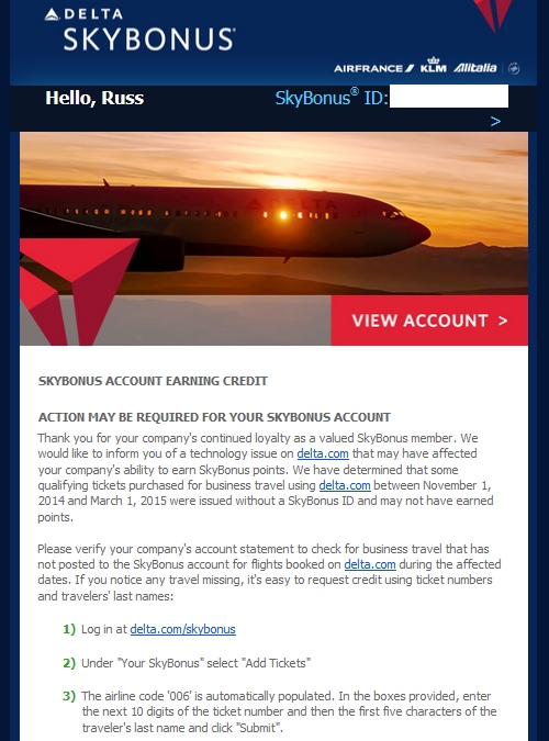 They direct you to go back and submit all your tickets (as well as any employees) going back to November 1st. That will be a ton of work for those who have maybe dozens of tickets that did not post as well as employees who you may not have as simple access to their ticket history as your own at “My Delta”.
