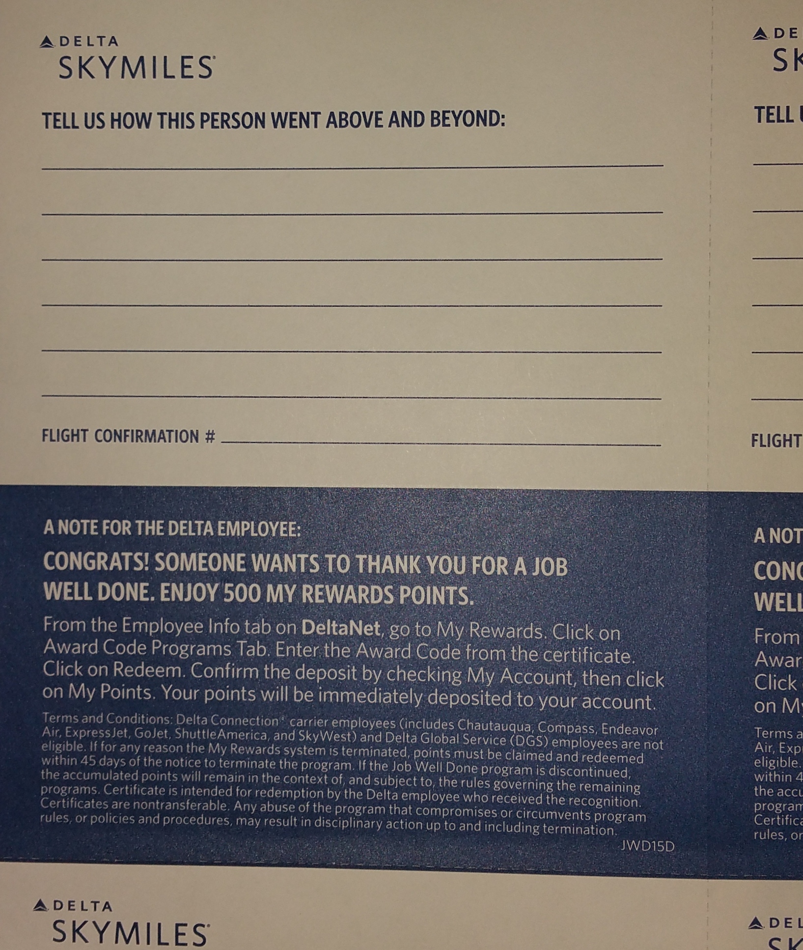 The next bit is the item I really wanted and care about (and my favorite part Delta). The JWD or Job Well Done certificates. These were once, I was told, worth 1500 points each to those whom you gave them to. Today they are 500 each as a Diamond. Those points can be turned into cash. I really like being able to thank reps for when they go above and beyond. Even phone reps (#TIP: you just read them the number over the phone).