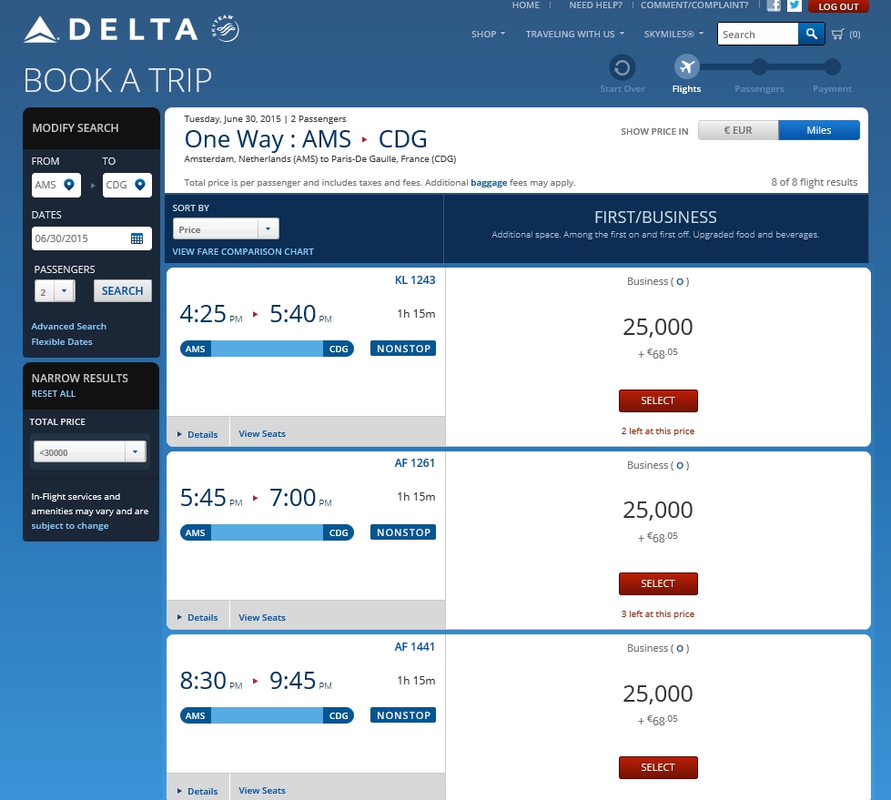 If I search ATL to AMS (Amsterdam) I come up with a much lower price, that is the old “LEVEL 1” pricing of 62,500 points one-way in business class. And here is where it gets interesting. Let’s say I keep searching from AMS to CDG.