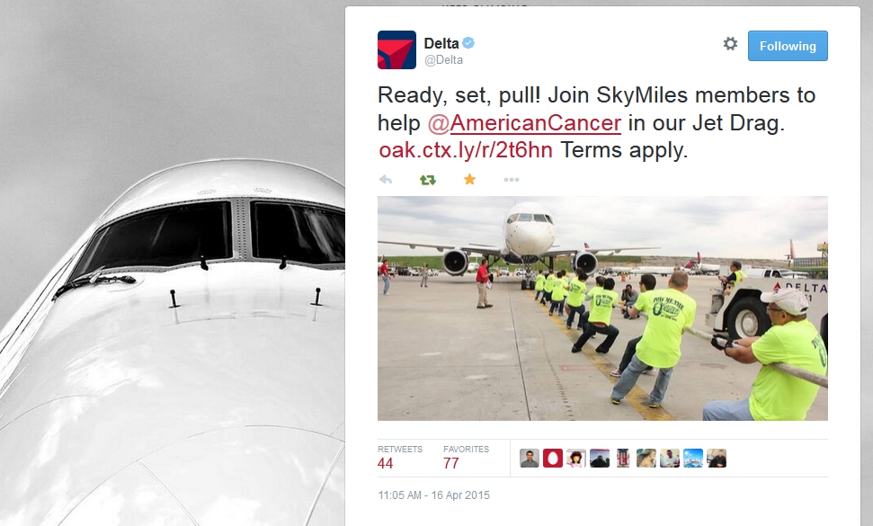 You will get: “A spot for you and one (1) guest to compete as part of a team of 20 in the Delta Jet Drag at the Delta Technical Operations Center on Friday, May 1st between 9:00am and 10:00am”