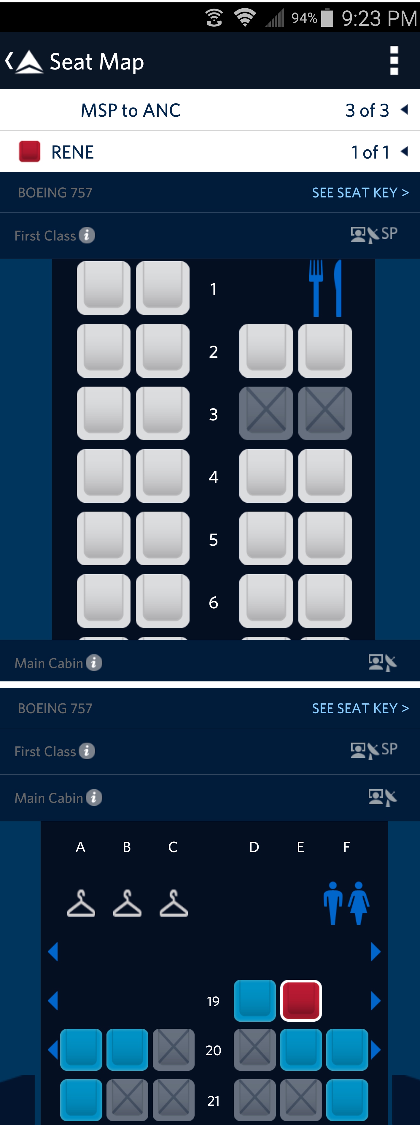 AH HA! So all the seats are NOT taken. In fact, only two seats in the entire cabin are taken by passengers. Well that is interesting, but is this a bug or a planned move by the “mothership” to keep even more information from us? Let’s fire up the Fly Delta App and see what it shows for my flights,