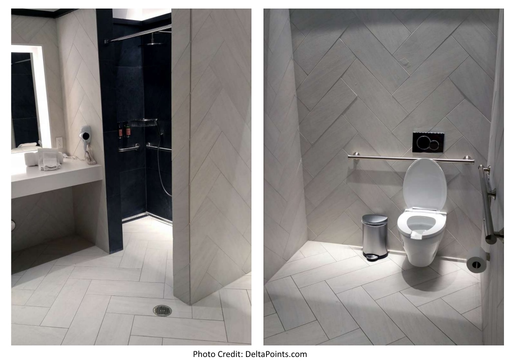 At the end of the hall, turning left, you have seating and the bathrooms.