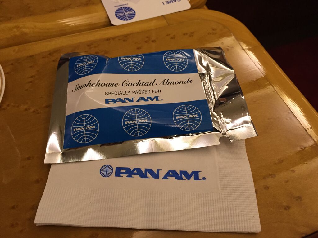 After everyone sat in their seats, the crew gave us a hilarious safety demonstration, and more alcohol was served. The attention to detail was just amazing; everything from the cabin to coasters, drink stirrers, even the ash trays proudly displayed the Pan-Am Brand.