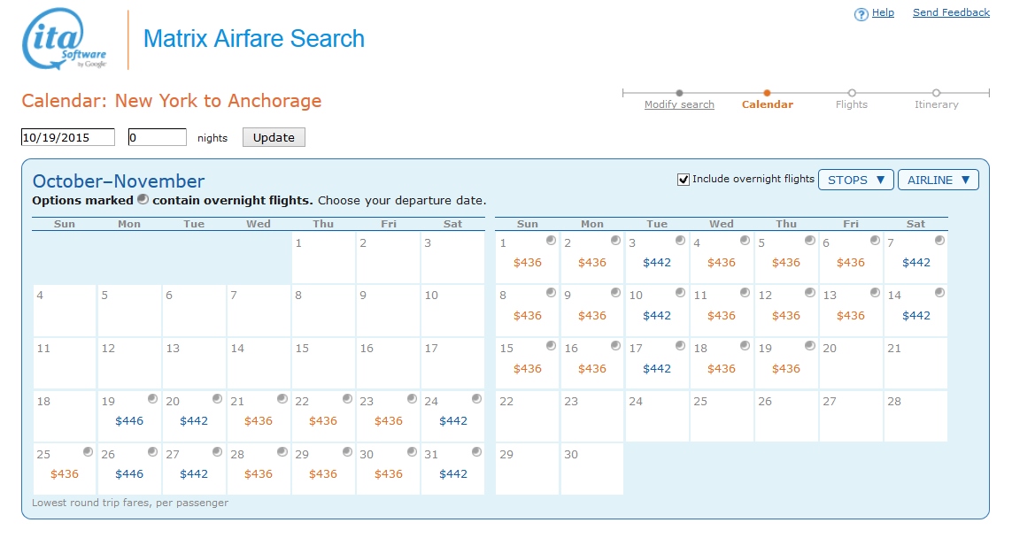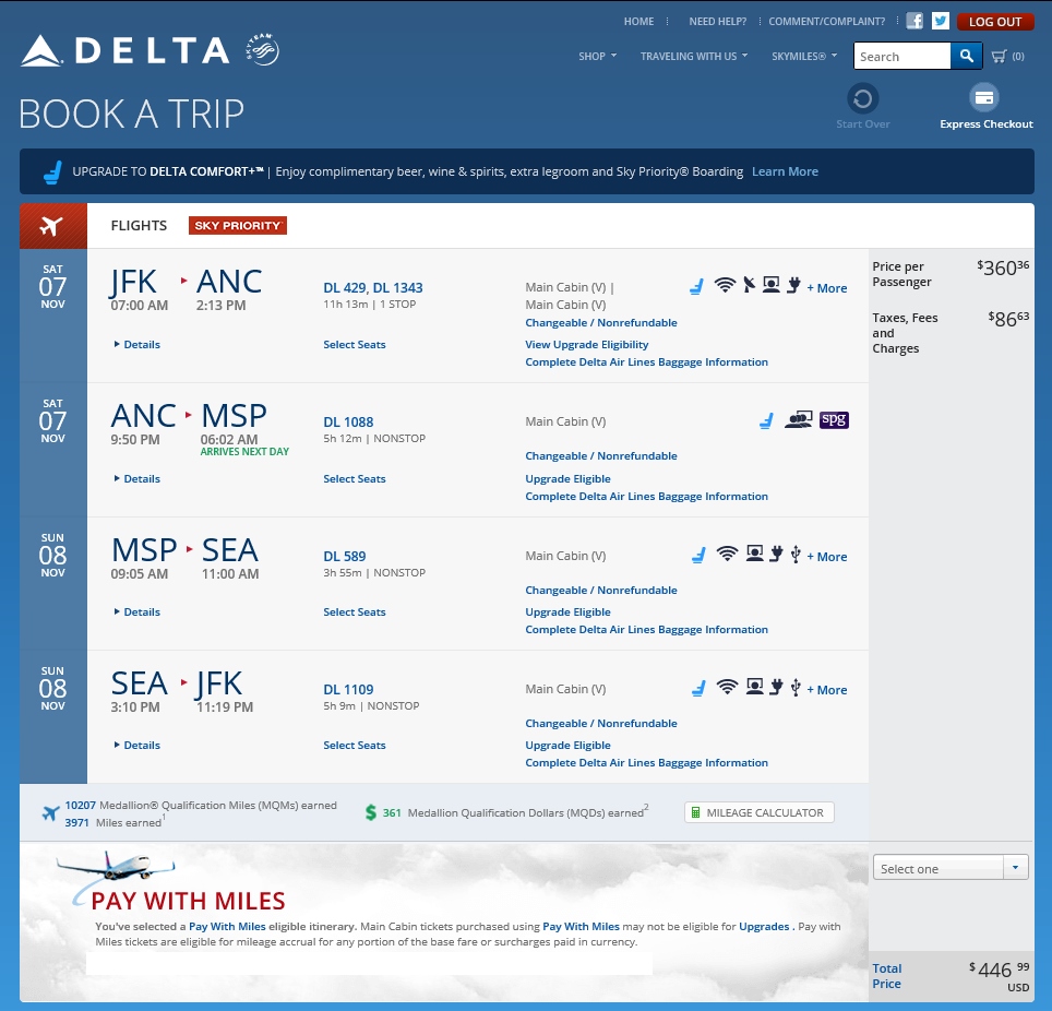 You can start the run early on a weekend and be back in time for bed Sunday night (just a little bit sleepy). You can, on weekdays, get a slightly lower CPM but this one does fall in line with the reader requested sub 5CPM weekend rate. Lastly I did need to use KAYAK.com to find the return route ANC-MSP-SEA-NYC route and you may be able to sub in other NYC airports if you want. A HT to TFD for the inspiration and tweaking by me!