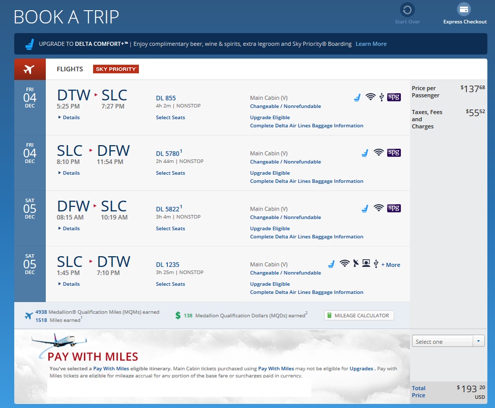 For now the folks in DTW get to also have a shot at the fun in Dallas. I am only finding two dates that have what I am looking for as you see above connecting via SLC both ways for max MQMs and lowest CPM. Yes it is an overnight but why not as talked about in the runs for MSP and NYC yesterday!