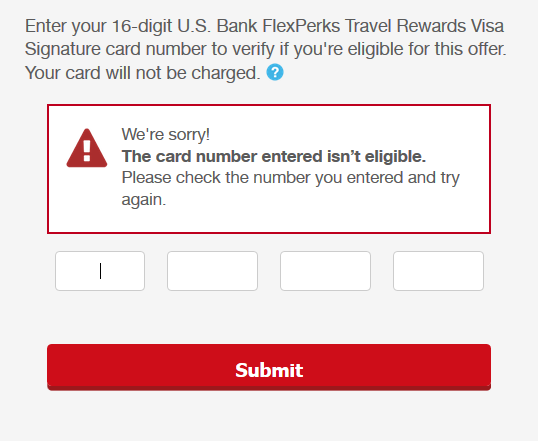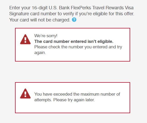 I also tested other Visa Signature cards as well and was REALLY told no so this does only seem to work with Flex Perks, primary user, Visa Signature cards (i.e. no AMEX FlexPerks cards), but I think it should work with all of them but will wait to hear your comments.