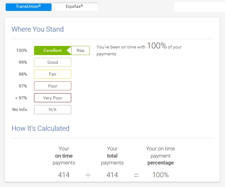 Notice the screen shot above from some of my payment history. Also take a very close look at the scale for this big part of your credit score. Do you see it? Folks if you ever even miss one single payment EVER you are not at 100% and you have dropped from “Excellent” to “Good”. In other words, it is not good to ever miss a payment. Period. You drop from 99% to 98% and you are just fair in the eyes of lenders. You can see how quickly the 97% or 96% score on the scale drops you into the basement.