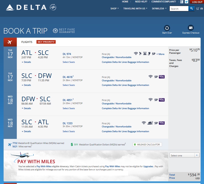 Atlanta to Dallas 1st class $594 & 7732MQMs at 7.6CPM weekday Delta Elite Mileage Run