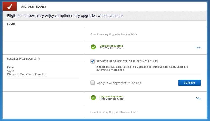 Hi Rene….I see the new Box, but I also noticed That it appears I must confirm the request for an upgrade. And also apply this to all segments in the trip.. Strange language.