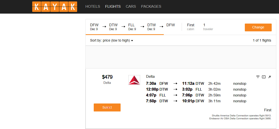 As you can see by the posted calendar, there are a handful of dates that work in December, the one I am showing as an example here is the sweetest! It is a same-day run that leaves Wednesday morning, routes through Detroit (in both directions) and gives you just over an hour layover at the Fort Lauderdale airport before beginning your return flight to Dallas. As boarding typically begins 50 minutes prior to departure, this is a walk off the plane and get in line to board the return!