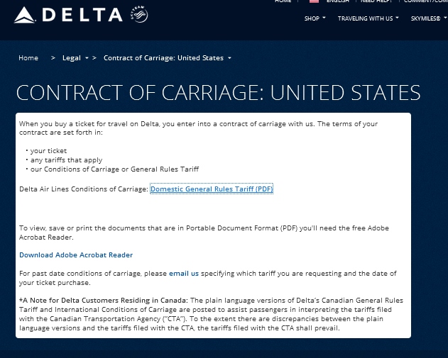 Have you ever even looked at the Delta Contract of Carriage (COC) domestic or international? I bet most of us have not. Really we should as it does spell out just what is allowed and what Delta will do for us if things go wrong. If we really want to be careful we should, each time we buy a ticket, download the current COC as it changes now and then and the rules at the time of purchase govern the time you fly even if much later on.