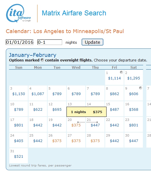 A reader wanted a flight tonight from LAX for a quick year end mileage run. Ugg. I did not find much. But in my search I did find this little gem for you in the LAX area. You can work it a bunch of ways including, at the lowest CPM, with an overnight. Or, for a slightly higher price red-eye out Friday night and be back home Saturday. Either one works at a decent price. Be sure to pick via DTW & MEM for max MQMs and lowest CPM (on page two of Kayak link below)
