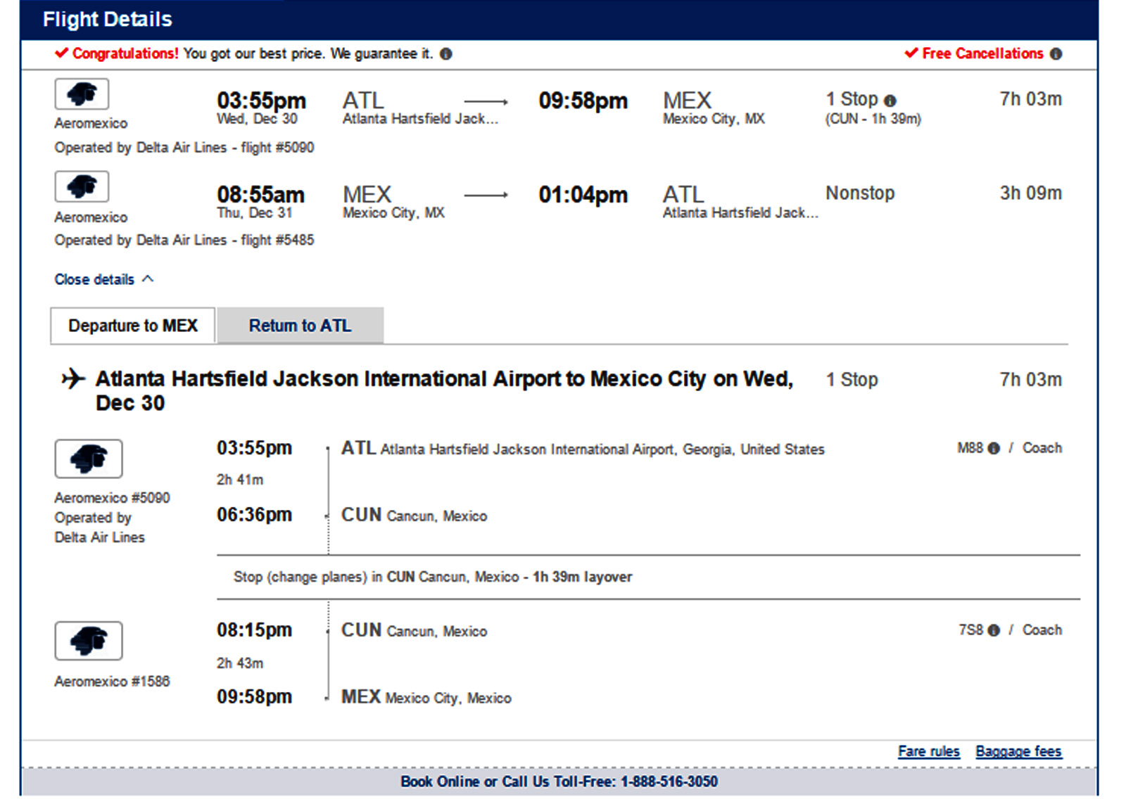 Now, the best (cheapest) deal right now is Atlanta to Mexico City via Cancun. That is good for 3,010 MQM’s on your Delta SkyMiles account.