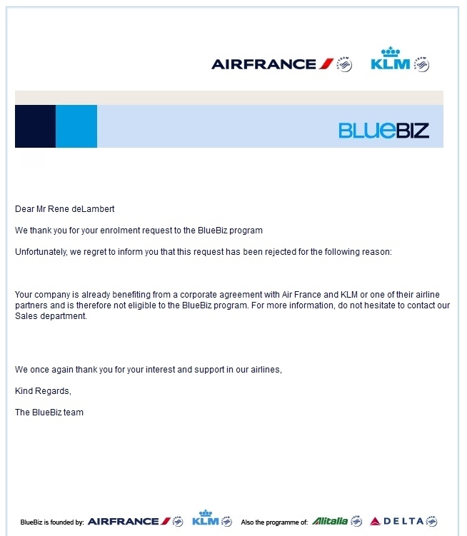 Well as most readers know, a number of us were kicked out of Delta’s SkyBonus business rewards program this year due to not having 5 employees who flew at least once, at any price, on Delta. Yep, it did not matter if you spend $50,000 with Delta as a sole proprietor – Delta hates small business and you are out. So why not give Flying BlueBiz a shot. But there were some problems with this idea.