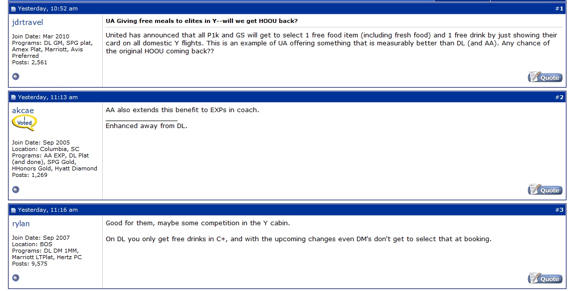 You see AA, apparently, when you are a top elite and stuck back behind the curtain, that is, not in 1st class or business class, you get a free meal / snack choice from the beverage cart (and a drink included). Well it seems, according to the FlyerTalk link above, United is following the same course. Now United needs to do whatever it can to keep elites from revolting onboard so this seems like a good move. But if AA is offering this kind of service to top elites, and UA is as well, what about Delta?