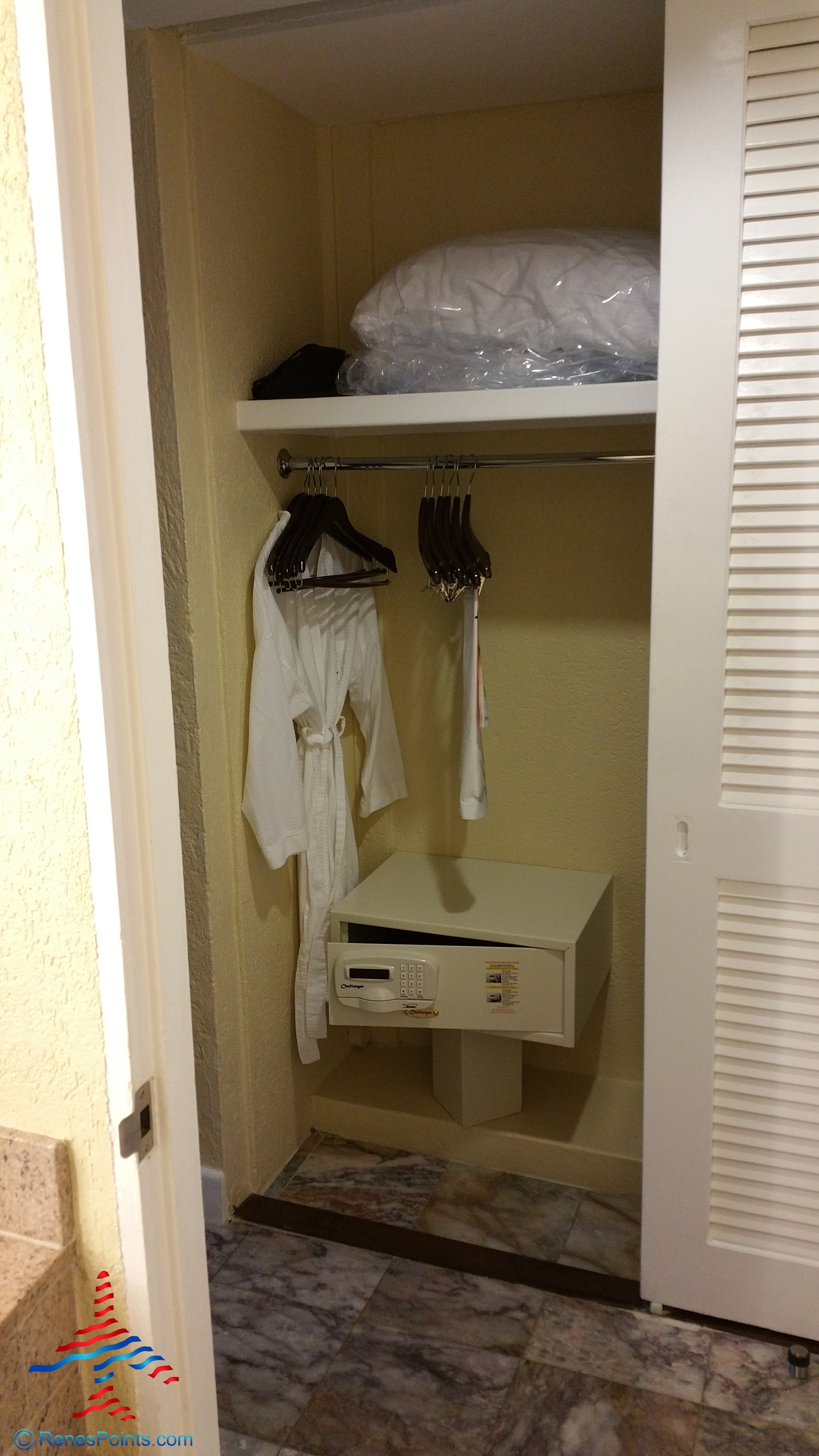 Outside the bathroom was a large closet with a VERY large programmable safe. I really liked this and it was a nice touch. It was pleasantly large enough for us to put two 14″ laptops, tablets and phones and more inside each day. One of the biggest room / hotel safes I have seen. They even included a robe for me. Nice touch!