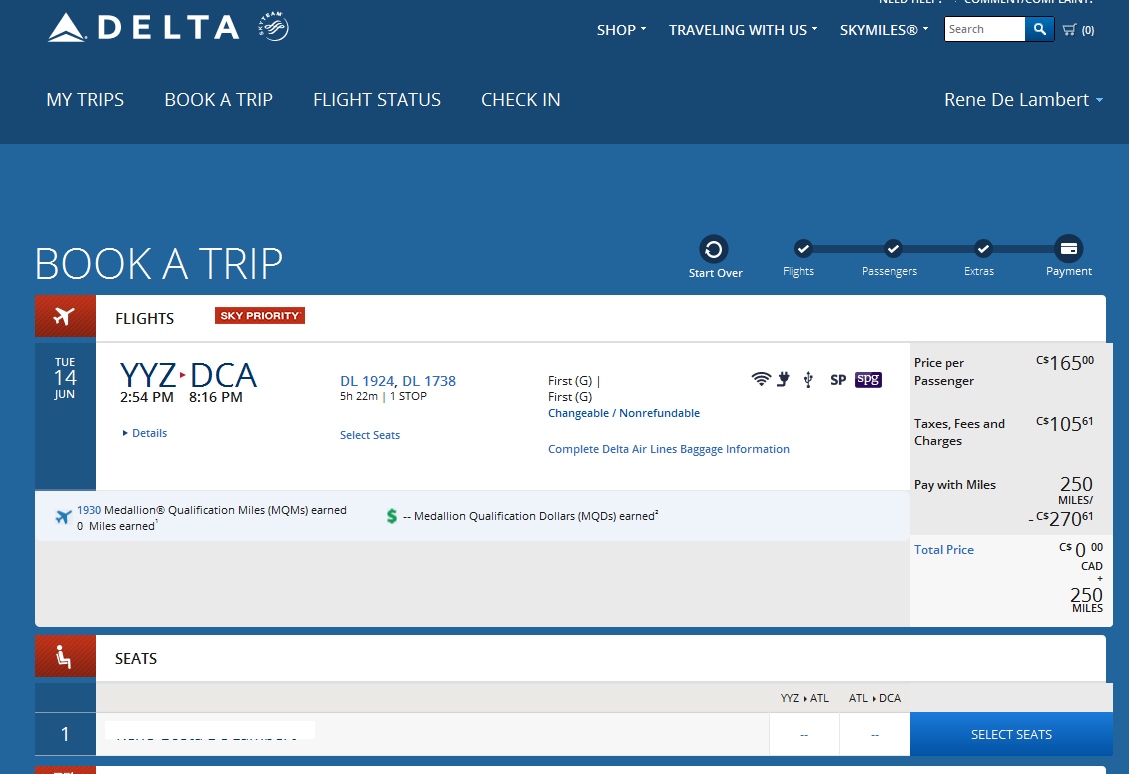 With a HUGE HT to a reader and Dan’s Deals you can book some stunning PWM or Pay With Miles flights if you have a Delta AMEX card. For as little as 250 SkyMiles you can fly 1st class. You will earn ZERO SkyMiles but you will (or should anyway) earn MQMs with PWM (but in past tests you earned both as well as Crossover Rewards and even SkyBonus points if you are still in that program).