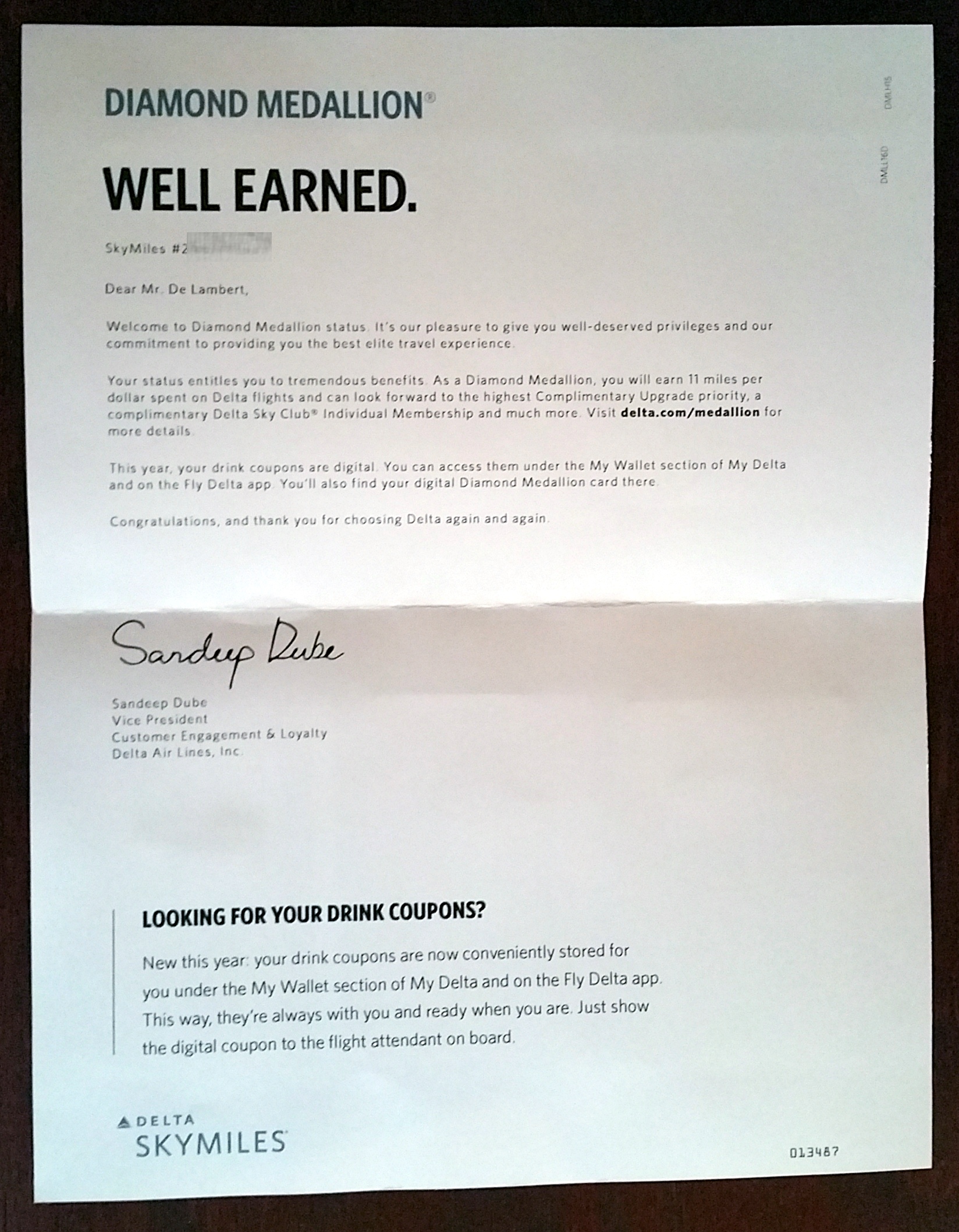 I got a nice letter from Sandeep Dube from SkyMiles telling me, not just once in the letter, but also in BOLD at the end that I will soon have access to digital HOOU or have one on us coupons. I both like and dislike this. I like it that they are in the app and I can pull them up any time I want in-flight without digging in my bag for paper. I don’t like it if I cannot still print the digital ones and give them to someone else if I want. Looking forward to testing HERE on Delta.com.