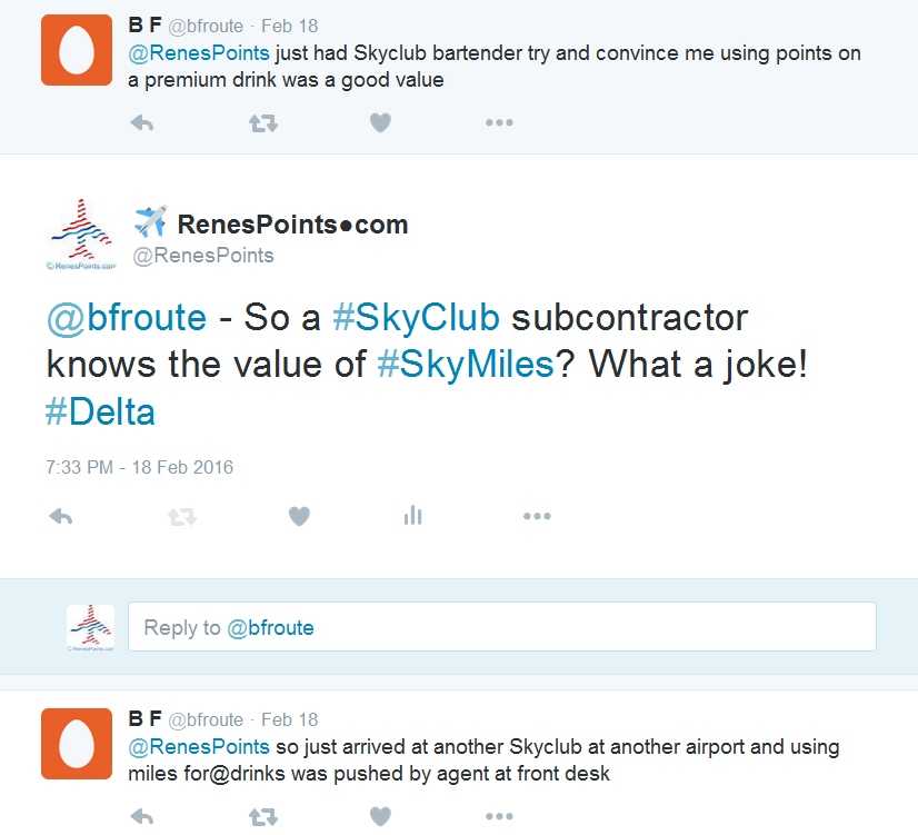 The above is a twitter interaction with me and reader “BF” about the expanding policy of Delta offering for you to buy “premium” drinks in the clubs with your SkyMiles at 1 cent each in value, that is, if you have say splurged for a $48 dollar bottle of Champagne, as recommend you do by the Delta management in the latest quarterly conference call, you would then spend 4,800 SkyMiles for this bubbly wine.