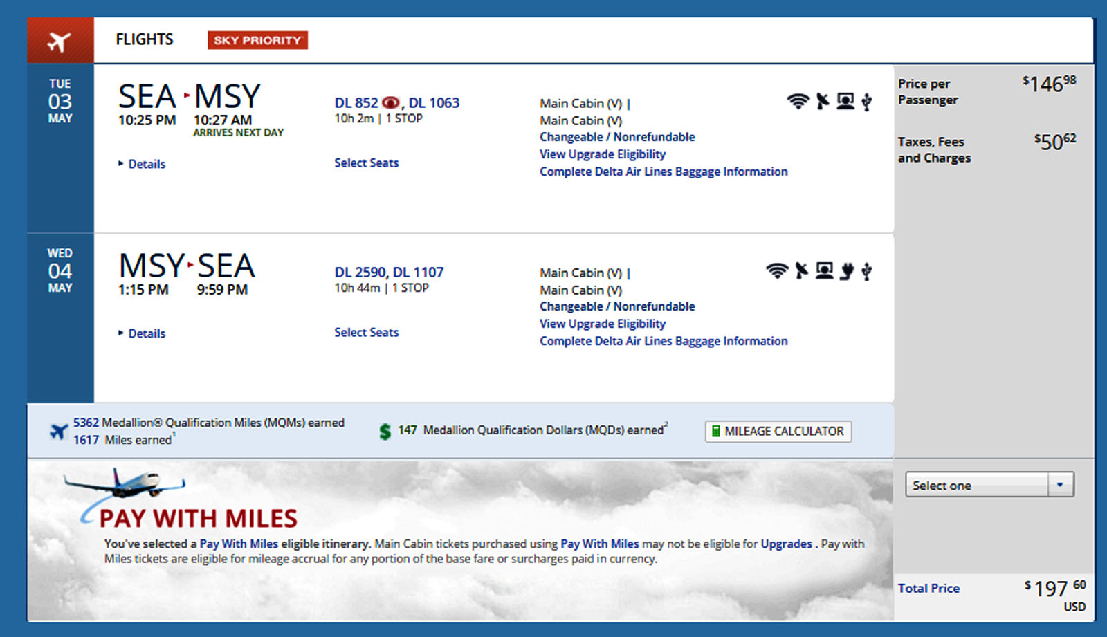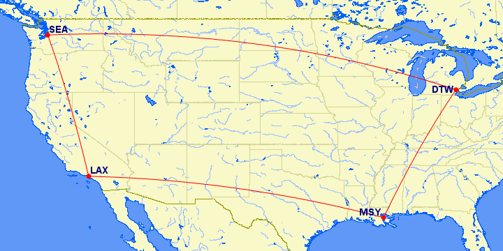 Either way, the best you can do is 5,477 MQM’s at about 3.6 CPM. The layover on many of the flights is less than two hours, so these are easily done in a flight plus a connection in either direction; most involving either an overnight flight or a required one night stay. But there are much things worse than a night in New Orleans (or Seattle if you’re Sleeepless…)