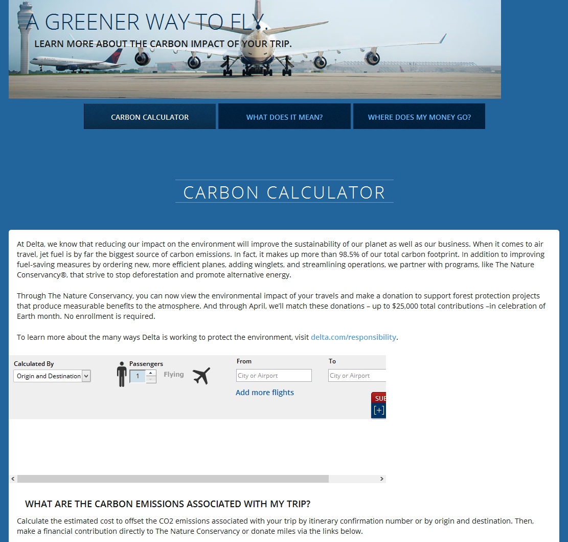 This carbon footprint as promoted by the airlines is just a big “smokescreen!” Delta just made Billions $$ and yet they expect the passenger to help contribute to reducing the carbon footprint. Where does that money actually go? Now I firmly believe that global warming is real and is causing future harm to the planet. Perhaps the airlines should be more concerned by innovative advancements in aircraft and etc. than to be concerned with the customer paying for the damage the airlines causes. Does this mean that soon we will see Delta telling us that we must pay more for comfort plus seats because they produce a higher carbon footprint due to the massive extra legroom involved?