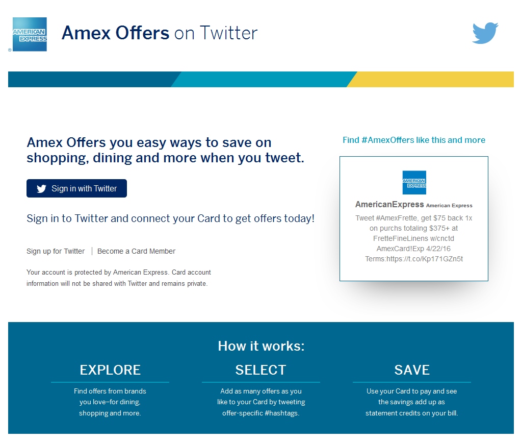 But for a while AMEX was blocking you if you already had an offer on one card from allowing you to use a 2nd, 3rd and so on Twitter accounts to SYNC other cards you may have for some offer. This, at least when it comes to the current amazing 40% off Carrabba’s offer using / Tweeting #AmexCarrabbas (love that place). I have successfully registered all 5 of my current AMEX credit and charge cards for this offer that is good through the end of May.