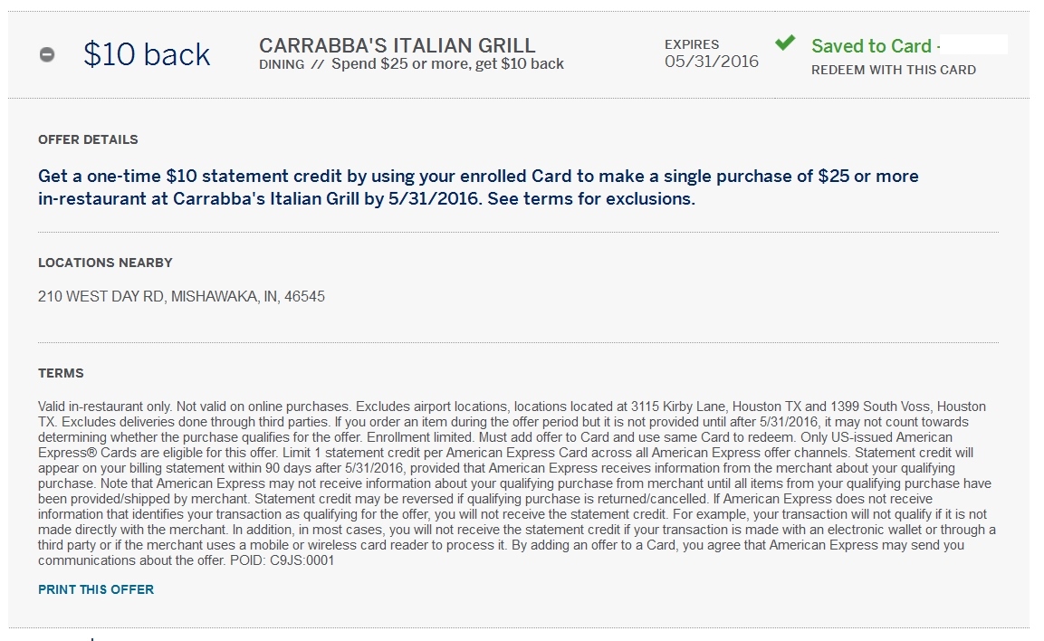 Lastly will the T&C exclude you from getting the bonus across more than one card when you go to spend for the offer? Each card tends to be unique. I have never had a problem getting a SYNC deal across multiple cards and don’t think you will have any issues either. Before the end of May Lisa & I will surely visit Carrabba’s at least twice and should be able to net out $40 off at least. By the time I leave the parking lot of the restaurant I should get an email from AMEX alerting me that I have just spent the required amount and soon will receive the credit. – René