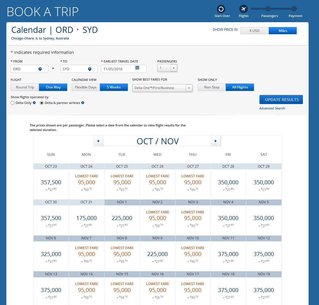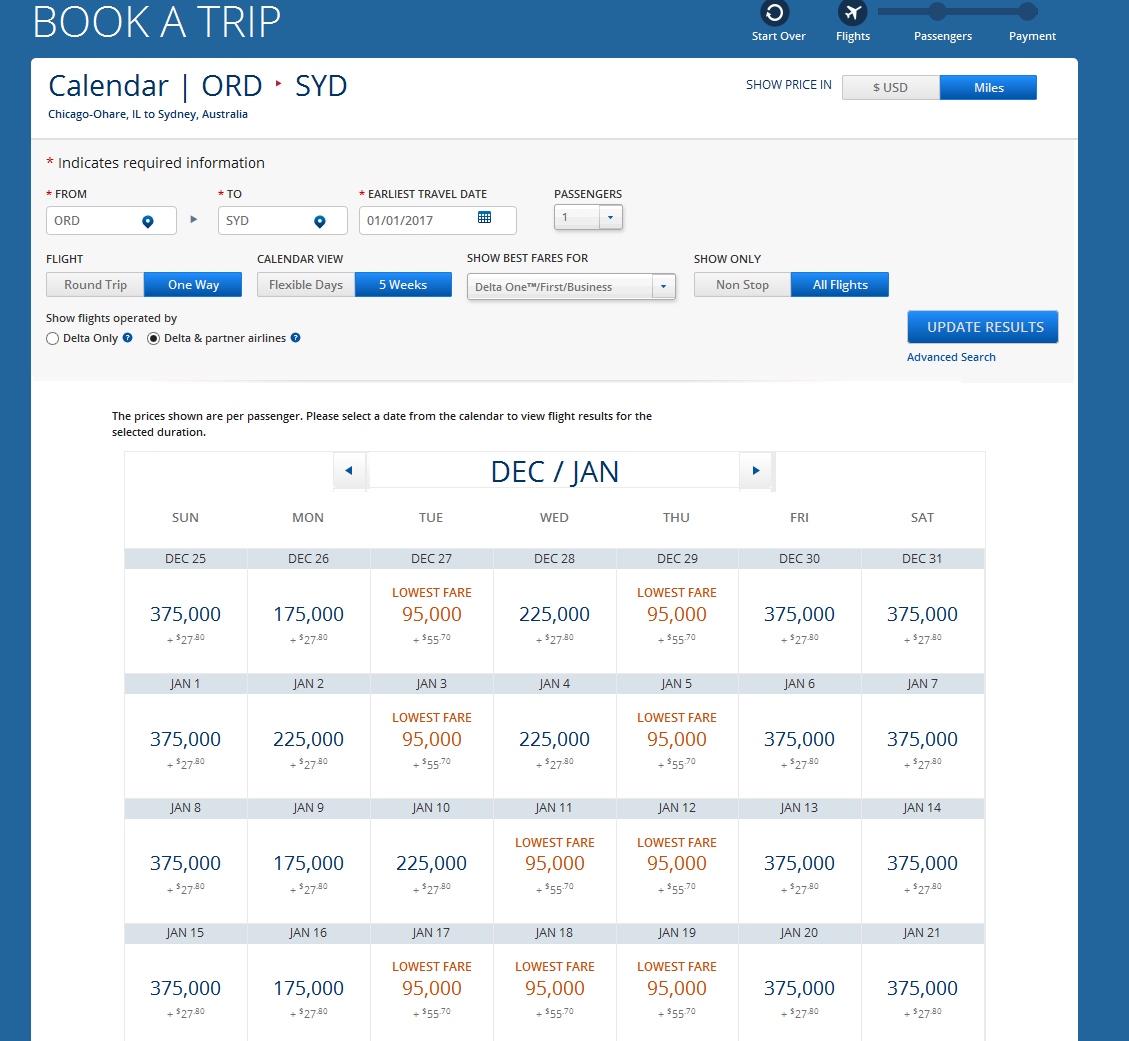 Just like the unannounced change from USA to Israel that my fellow blogger Gary from View From the Wing blogged about, it seems the same change has hit trips to Australia, that is, the price has JUMPED by 30,000 SkyMiles round trip. Thanks Delta. Honesty, Integrity and Respect is sure what we are seeing here.