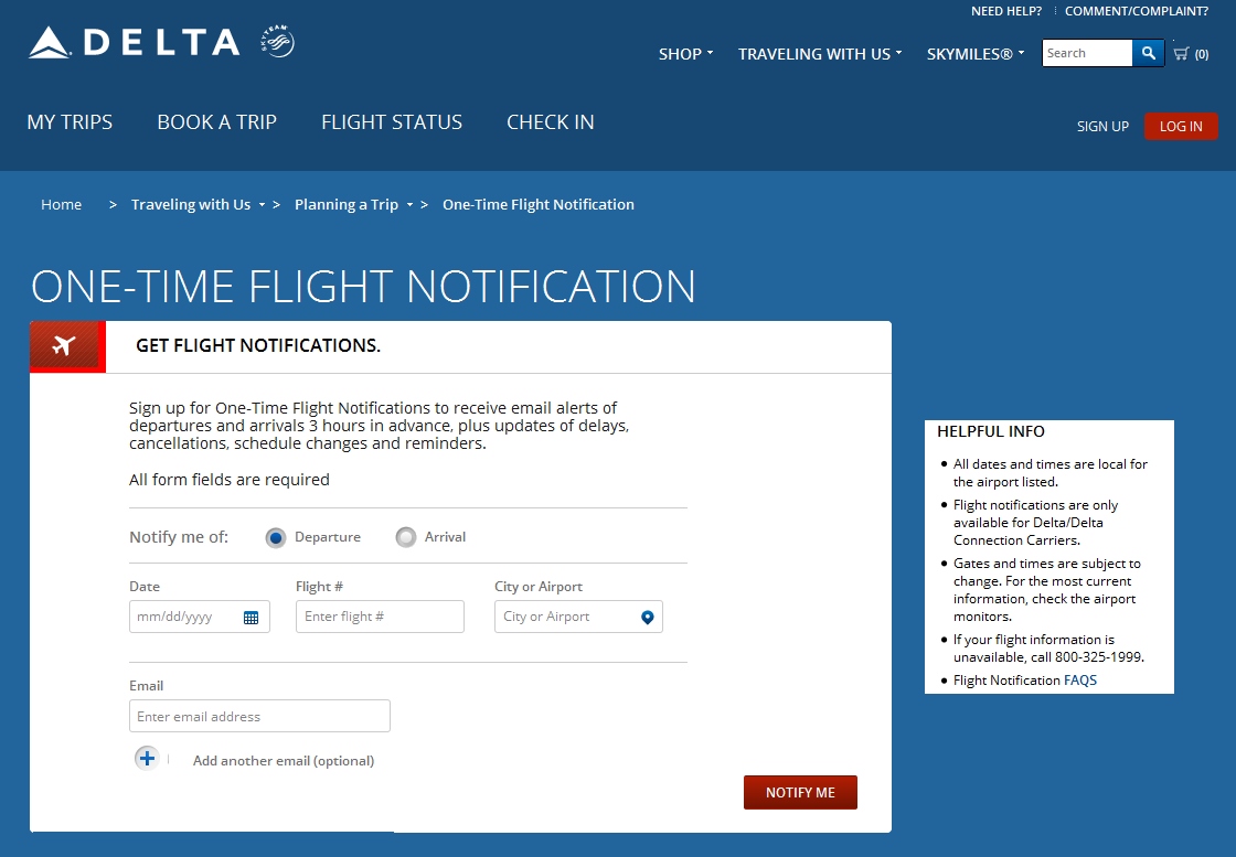 It is super simple and since you can even access Delta.com via Gogo free you could do this once up in the air. Just plug in the date, choose arrival or departure, the flight number and the email you want to notify. Want a copy yourself? You can add another email to alert at the same time. – René