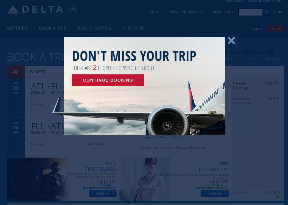 Well as you can see from the above shot Delta will, now and then, yell at you to BUY NOW or, get this, “don’t miss your trip”! I assume this is in response to the fact that so many times, when you are paying for your ticket, you get the nasty surprise that says something like “the price for this ticket has just gone up” and they can now tell you that they warned you that others were shopping for the few seats remaining at that same price fare class you were shopping for. I am not overly impressed. You?
