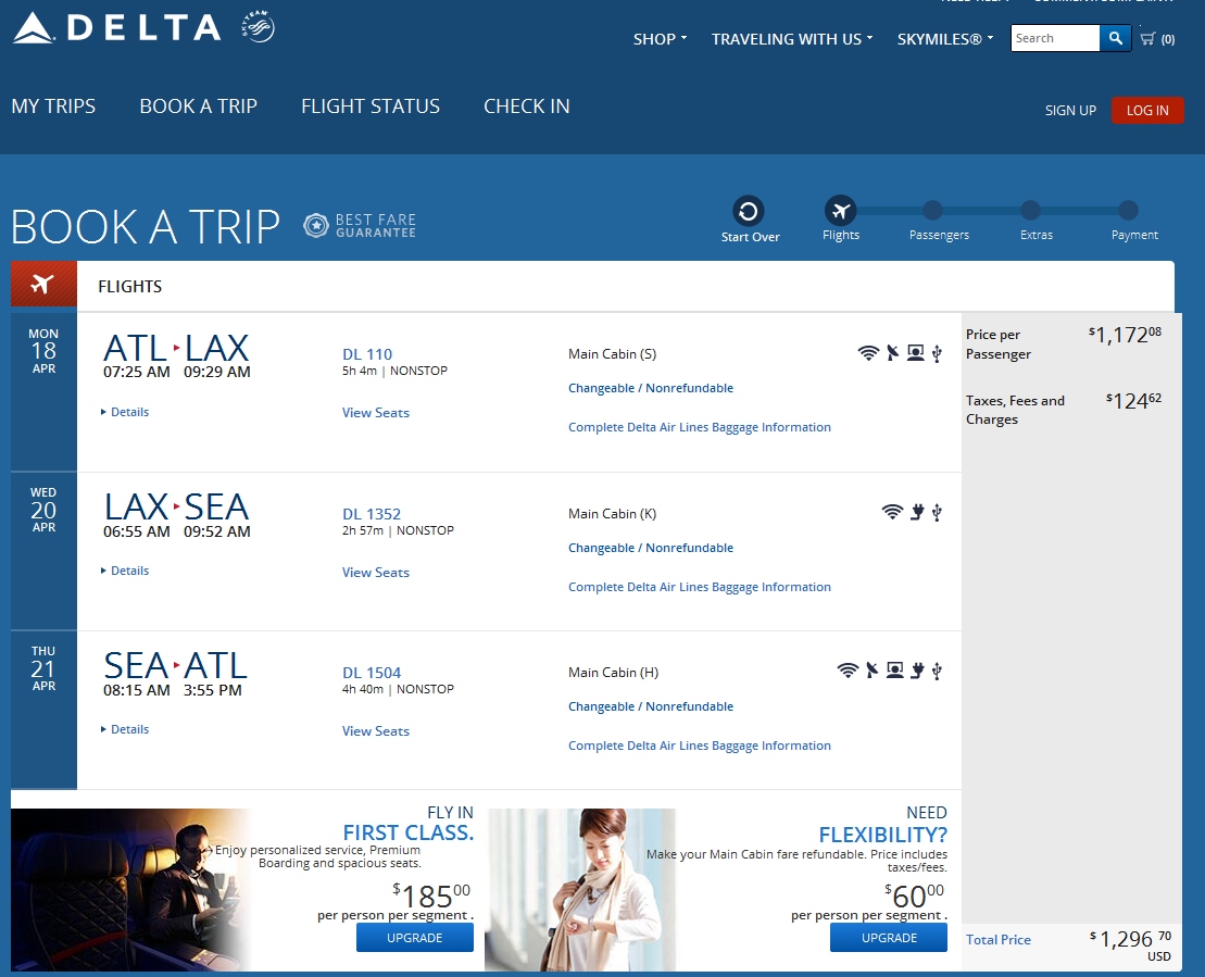 Notice what happens to the price of these 3 one way fares if we use the Delta.com multi-city tool and select the exact same flights. $1296.70! Yep, almost 30% more for the exact same flights on one itinerary vs booking them as 3 separate one way tickets.