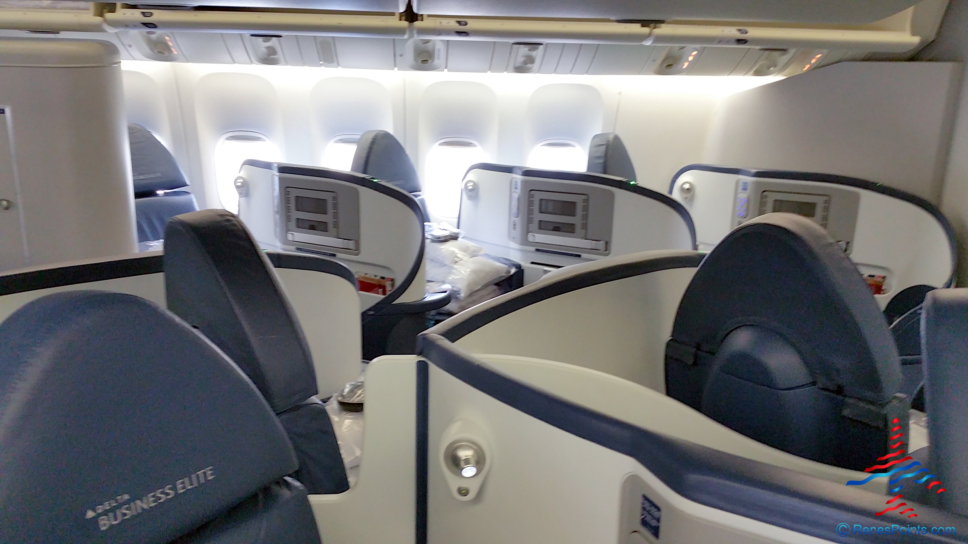 Notice the massive leg room in the front row. This has a hidden downside as you will find folks using the area in front of you to cross over. Really frustrating. But back to Delta One.