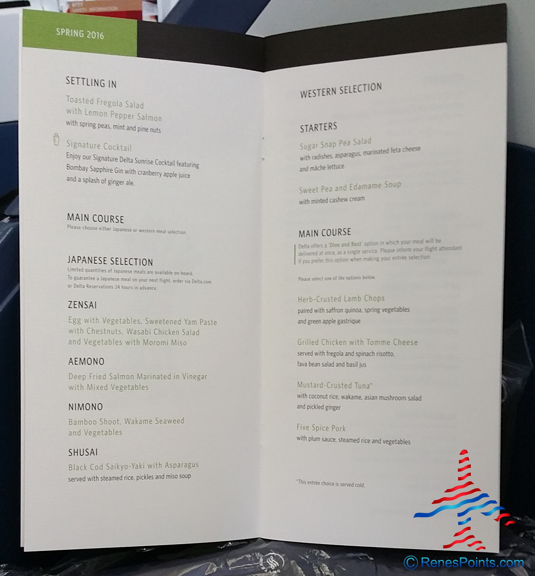 Good review, Rene. By choosing the last row in J, do you ever get closed out of your “first choice” meal selection? On International, they always take meal orders from front to back, no matter whether the flight is even or odd. Also, I fly Delta One to Asia a lot out of ATL, and the Japanese meal is good, but much, much, much better out of Narita than out of ATL. The Japanese flight attendants will tell you the Japanese food out of Atlanta is not good Japanese food, but they like it out of NRT. I find the ice cream out of Narita is much better too, than from the states going to NRT. Just better quality. Period.