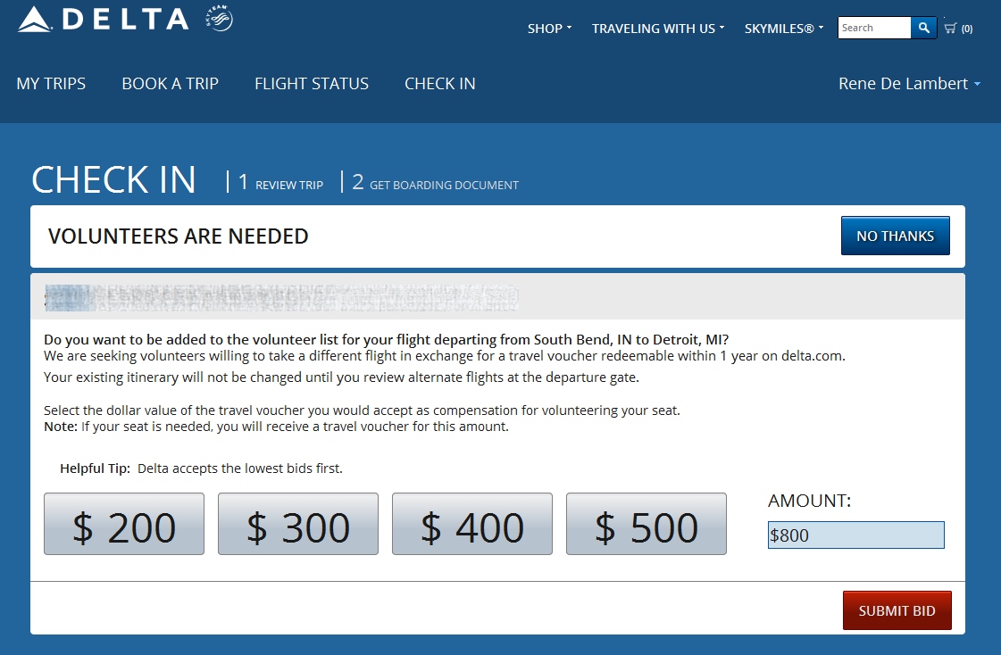 On Delta, 99% of the time, I always check in on Delta.com. I never use the APP to begin the process. Why? To date I have never seen the “bumpertunity” or chance to give up your seat offer on anything but Delta.com or airport Kiosk check in. Now I know that the online bid offer is not always the final offer but by bidding $800+ each time I have a negotiating point to work with. Sure, if the gate agent is a stickler I may miss out on a $200-400 bump but I really am AOK with that anyway.