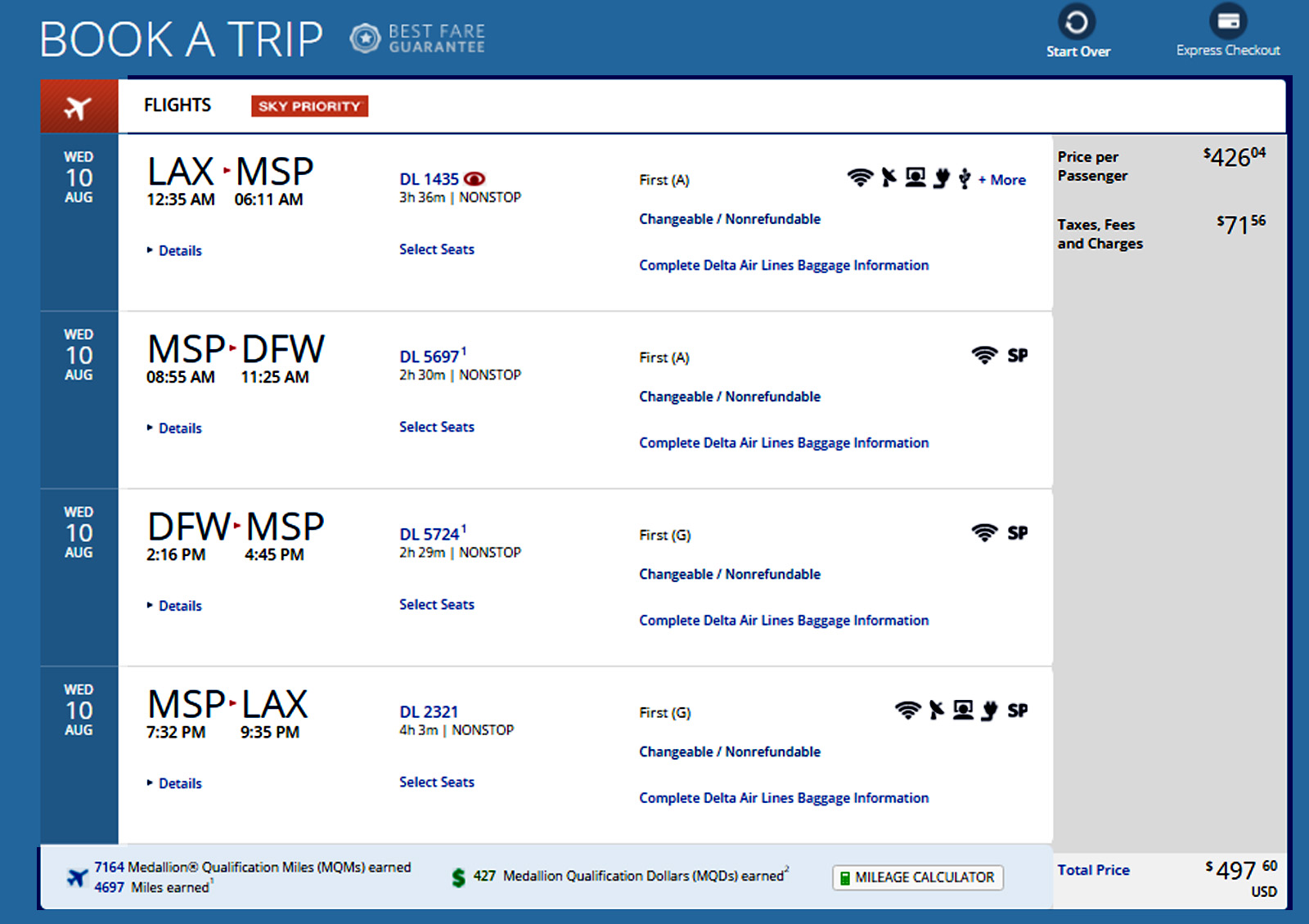 Routing through Minneapolis in both directions maximizes your MQM’s; one that delivers 7,164 Medallion® Qualification Miles! It also all fits neatly into a single 24-hour day on my example.
