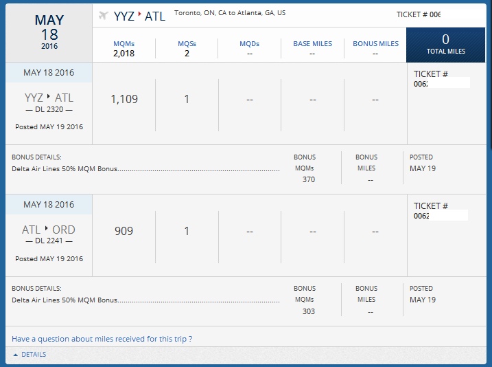 I was not surprised to earn ZERO SkyMiles for this “sale” ticket since others had reported the same. In my past testing of PWM or Pay With Miles tickets I had earned full SkyMiles as well as SPG Crossover Rewards and Skybonus points. Not so much with these tickets.