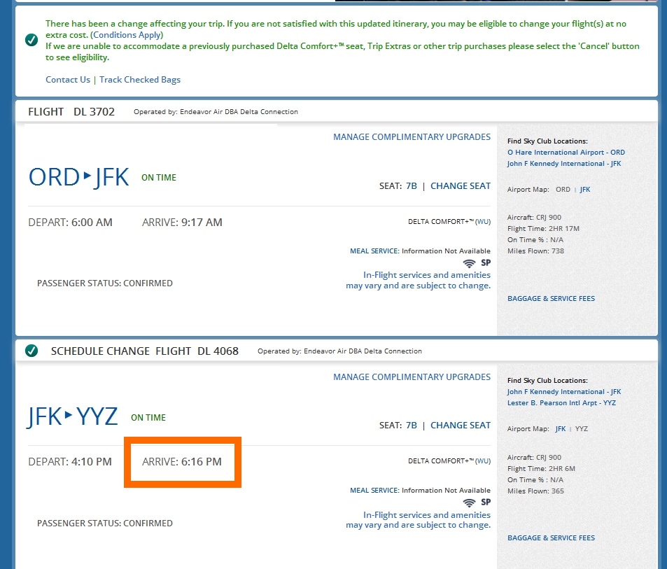 Take my latest one for example. I have one more of the sweet 250 SkyMile “sale” fares from YYZ to collect some MQMs for almost free. I have to get to YYZ with time to clear customs and then catch my 6PM flight back home. Now notice the red box and the arrival time I booked and then the auto-change Delta did for me and my arrival time. Yep, 3 hours and 15 minutes later than booked and most importantly arriving 15 minutes after my return flights have departed. I was given ZERO, NADA & NO notice by Delta about this change.