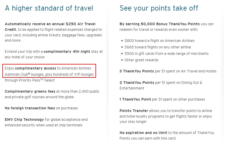 Right now, as you can see from the back of my card and on the application landing page, the card not only gets you Priority Pass (with two guests free unlike most other cards) but also when you are flying AA you get into AA lounges. The latter really is meh. AA lounges are not “that” great and if you are a frequent AA flyer you should have the AAdvantage Executive card anyway. The loss of this next year is really not “that” big of a downgrade folks! (HT to M2M)